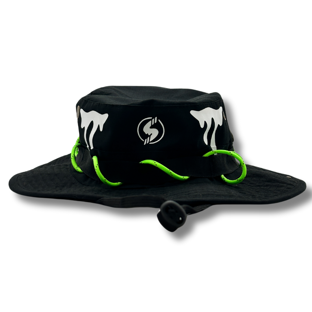 The Drippy boonie comes in black and a neon green reflective paracord rope. In addition, boonie features a wider brim compared to a bucket hat. Size Small/Medium. Fits most.